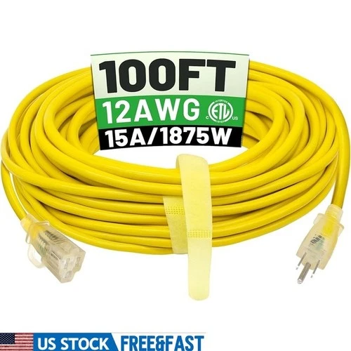 100ft 12 Gauge Outdoor Extension Cord Waterproof 15A 125V Heavy Duty Lighted End