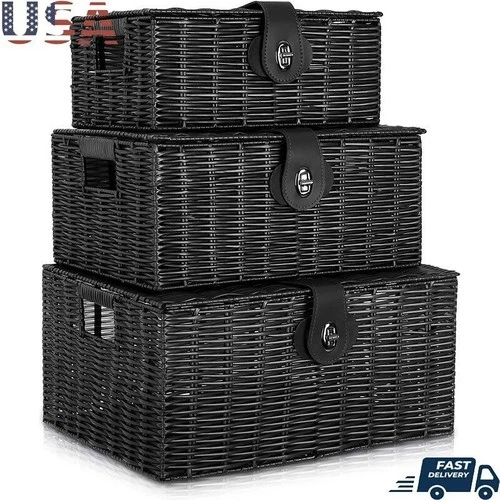 Set of 3 Woven Storage Baskets Stackable Bin W/ Lid Organizer Toys Laundry Home