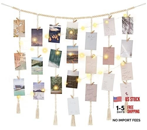 Macrame Hanging Photo Display Wall Decor with String Lights, Boho Large Ivory