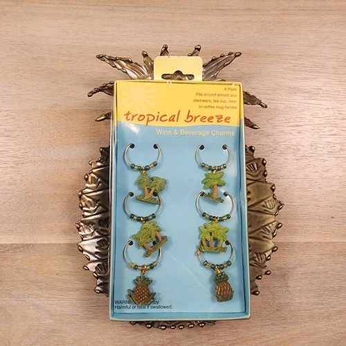 Vintage Tropical Party Pack - Gold Pineapple Metal Serving Tray and Wine Charms