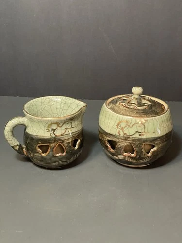 Vintage Soma Ware Somayaki Double-Walled Crackle Glaze Cream & Sugar Gold Horse