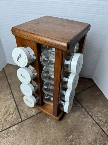 Vintage Wood Spice Rack 16 Slot Rotating Lazy Susan w/ 15 Containers