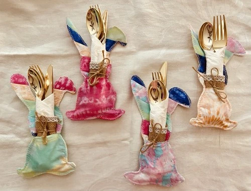 Handmade Bunny Quilted Utensil Pouched Set of 4 Multicolor Table Decor