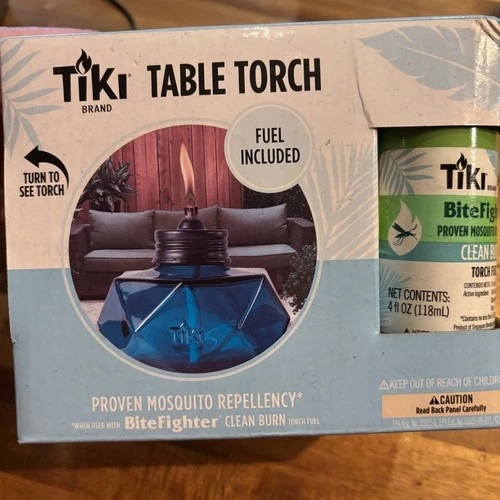 Tiki Brand Table Torch Blue Glass Geometric Mosquito Repellent Fuel Included