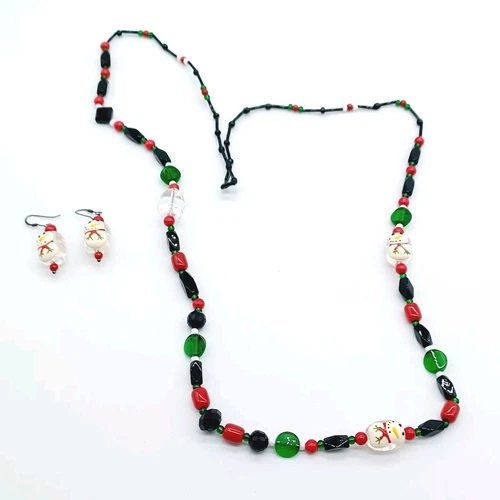 Christmas Beaded Necklace and Dangle Pierced Earrings Set-Snowman