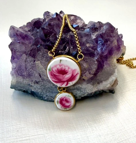 Broken China Jewelry- Pink Roses Vintage hand painted Plate, Unique