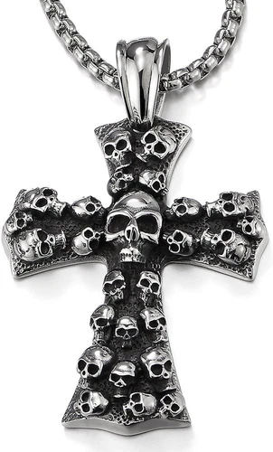 Mens Large Gothic Vintage Skulls Cross Pendant Necklace of Steel, Wheat Chain