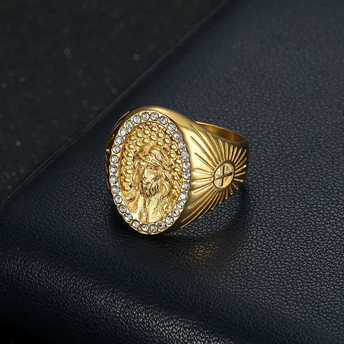 Rrtro Cross Jesus Face Ring Stainless Steel Gold Plated Zircon Religious Jewelry