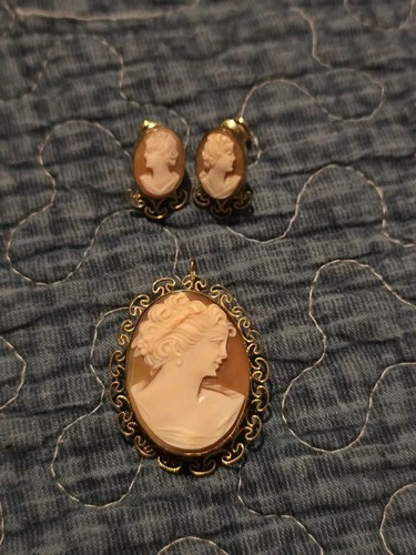 Vintage Victorian 12K Gold Filled Shell Coral Cameo Brooch Pendant Earrings Set
