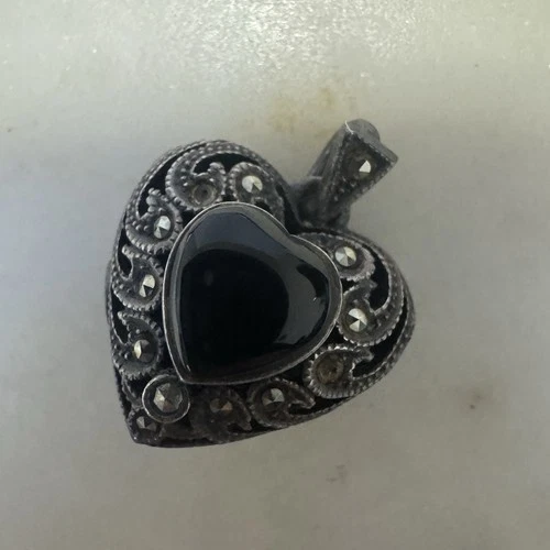 Vintage Sterling Silver Pendant Heart Onyx Marcasite Locket Photo Puffy Necklace