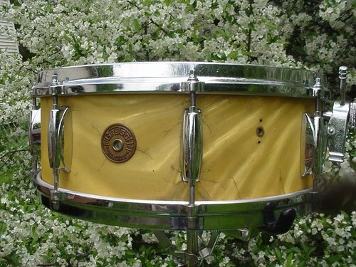 5.5x14 1964 Gretsch Name Band 4157 gold satin flame 8 lug snare drum #19016