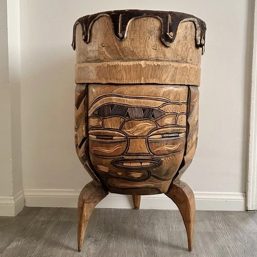 Vintage African Hand Carved Wooden Folk Drum w/ Stretched Hide 24.5” Side Table