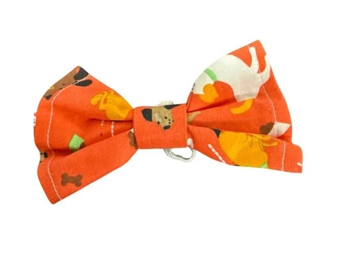 Orange Fabric Dog Bow Tie With Dog Bone & Puppy Print 4 Inches Wide Elastic Loop