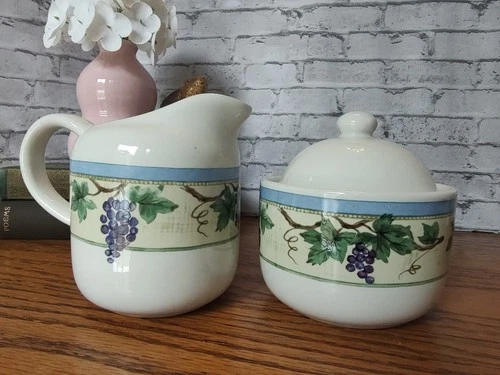 Pfaltzgraff MERLOT Creamer & Sugar Bowl w/ Lid Grapes Leaves Blue Rim Disc