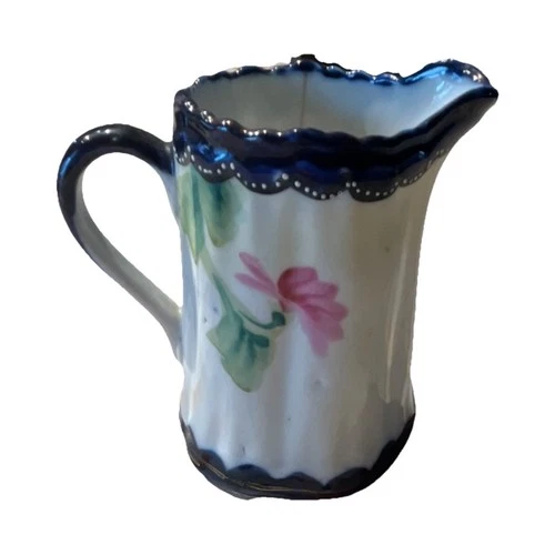 Floral Ceramic Creamer Pitcher with Handle, Blue Rim, Glossy Decorative Pottery