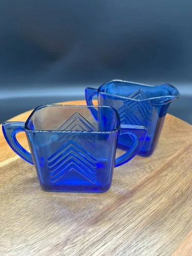 Cobalt Blue Art Deco Glass Creamer and Sugar Set by Hazel Atlas, 1930s