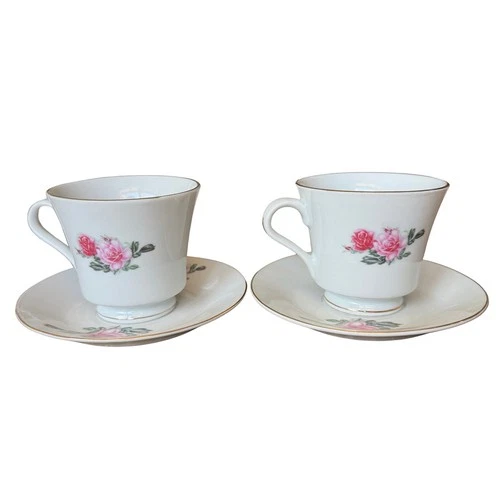 Vintage Pink Rose Bud Tea Cup & Saucer Set of 4 With Gold Trim China