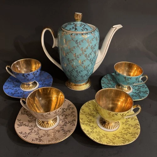 VTG RARE multi Color Chodziez Bouquet Polish porcelain coffee set golden inlay