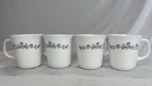 Set of 4 CORELLE Corning Coffee Mugs “Ribbon Bouquet” Grey floral; Retired