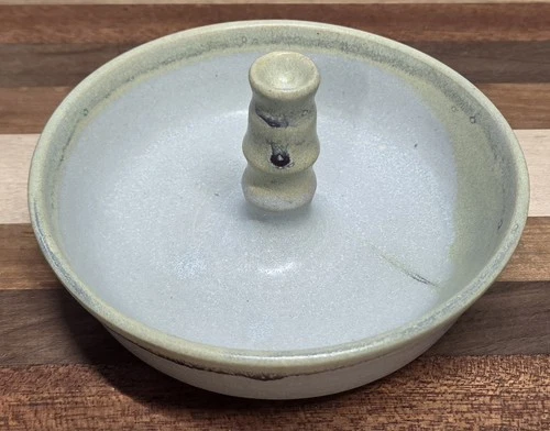Art Pottery Ring Holder Trinket Dish Hand Made & Painted Round Gray Drip Glaze