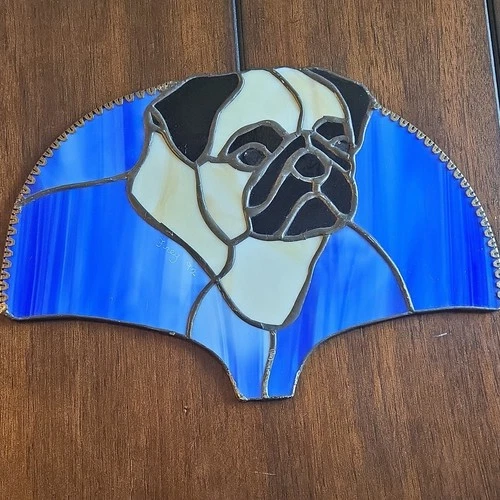 Frey Stained Glass Pug Suncatcher Blue Vintage 1992 Decorative Art Panel