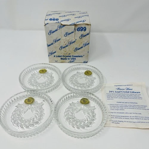 Set of 4 Princess House Crystal Christmas Drink Coasters Christmas Wreath 899