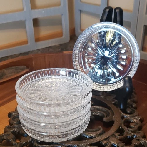 Clear Pressed Glass Round Coasters Set of 5 Etched Patterns Stackable Decorative