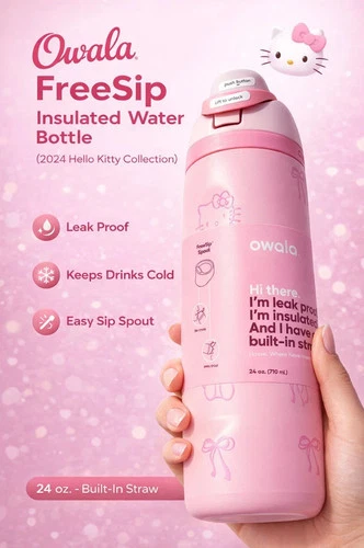 Owala x Hello Kitty 24oz FreeSip Water Bottle Pink Rose Quartz, Stainless Steel,