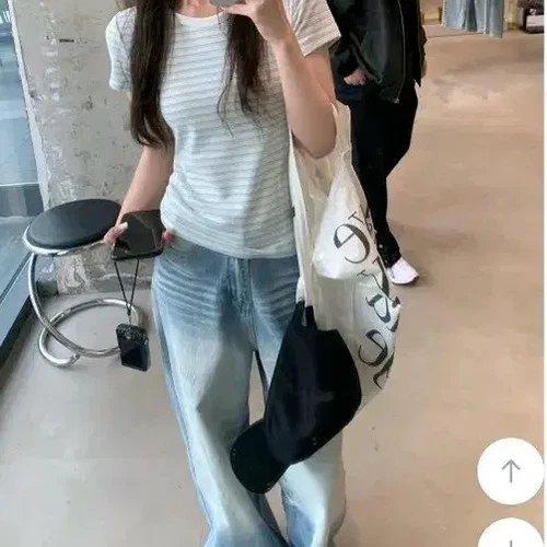 Women’s Sky Blue Striped Slim Fit Short Sleeve T-Shirt Casual Official
