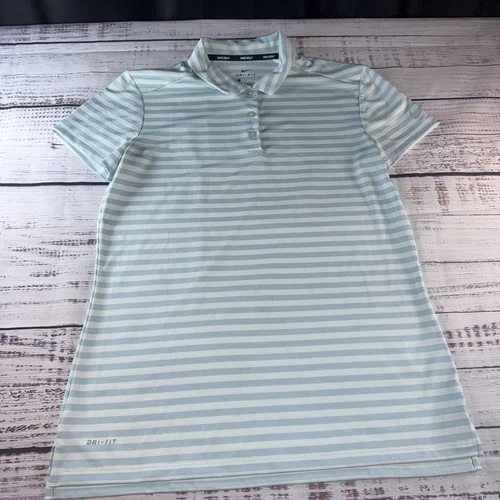 Nike Golf Dri-FIT Striped Polo Shirt–Women’s Medium Light Blue & White Top