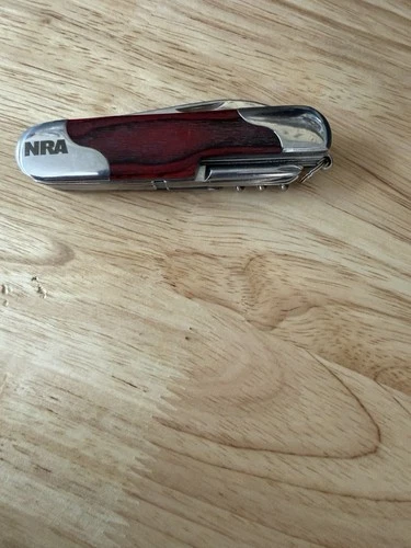 NRA Multi Tool Camping Knife Nice Wood Grain Inlay vintage hunting adv.