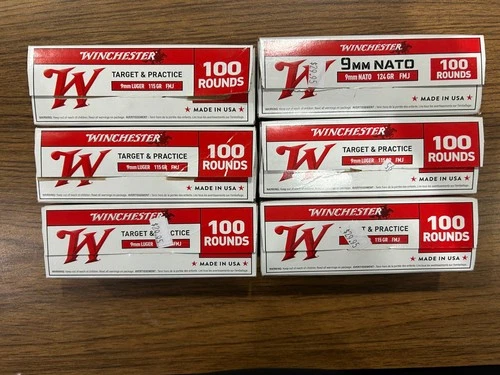 Lot of 6 Winchester 9mm 100 round empty ammo boxes with cardboard insert