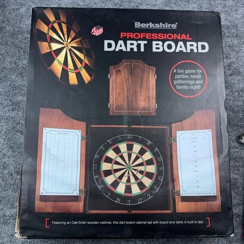 Berkshire Professional Dart Board Set Oak Finish Wood Cabinet 6 Steel Tip Darts