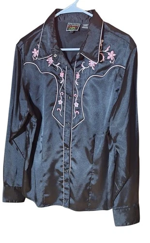 Studio West Black Satin Western Shirt Pink Floral Embroidery Cowgirl Medium