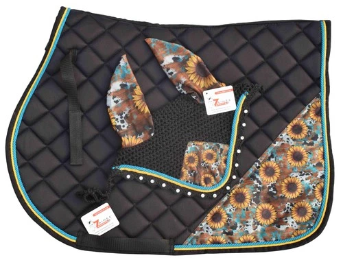 New Cow Mix Sunflower Print Saddle Pad Set with Matching Ear Bonnet Horse Riding