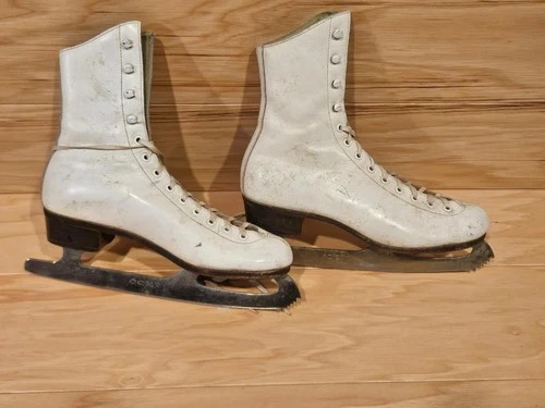 CCM Vintage White Leather Ice Hockey Skates Block Heel Pre-owned