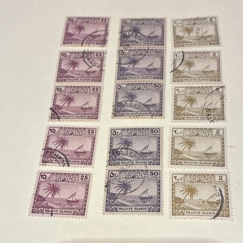 Maldives Stamps 25, 50, 2 Larees Used VF/XF Palm Trees Sailing Boats