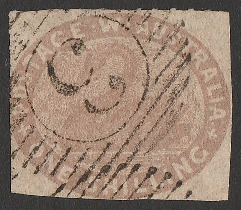 WESTERN AUSTRALIA, 1864 ONE PENNY, DARK CARMINE, USED/HINGED STAMP.