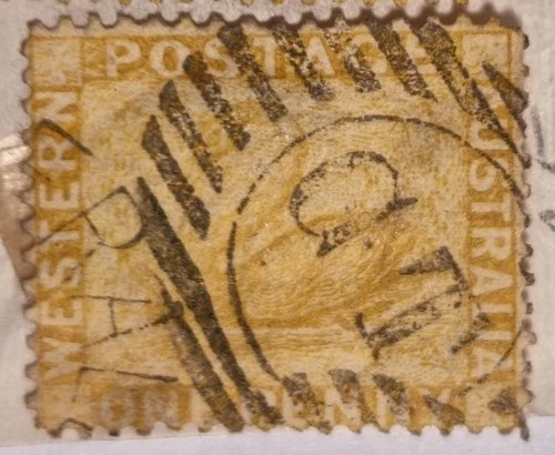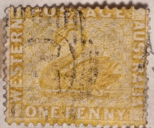 WESTERN AUSTRALIA, 1864-79 ONE PENNY, OLIVE BROWN, USED/HINGED STAMP.