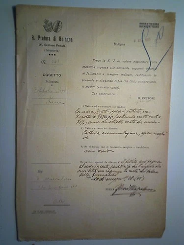 Piego Viaggiatato "R. PRETURA DI BOLOGNA BANKRUPTCY" 1928