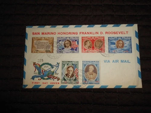 JUNE 16, 1947 SAN MARINO FDC W/FRANKLIN D. ROOSEVELT SUR CHARGE STAMPS 257G-257L
