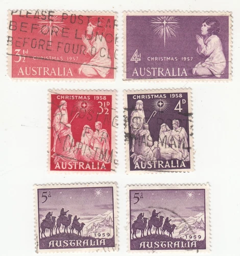 AUSTRALIA 1957-59 Spirit of Christmas, Adoration of Christ. Sc# 307, 312-13, 334