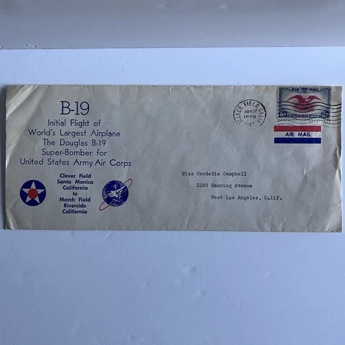 US Flight 1941 Douglas B 19 Santa Monica to Riverside Cover Mail to West L.A.