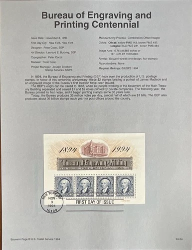 USPS Souvenir Page 2875 Bureau of Engraving and Printing $8.00 James Madison