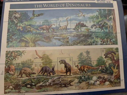 USA 32 Cent The World of Dinosaurs Postage Stamps, Full Sheet of 16, 1996