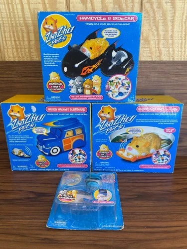 LOT Zhu Zhu Pets Woody Wagon & Surfboard Hamcycle Sk8Board Ski Hat Goggles NOS