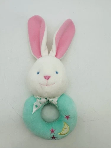Vintage Little Me Bunny Rabbit Baby Rattle 9.5 White Aqua Soft Plush Lovey Bow