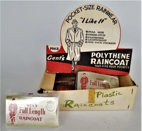LOT vintage 5pc GENT's POLYTHENE RAINCOAT unused STORE DISPLAY BOX men lady