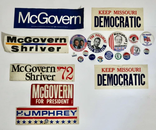 Democratic vintage political campaign pins and bumper stickers