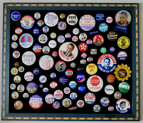 political campaign pins lot on a star and stripes bulletin board